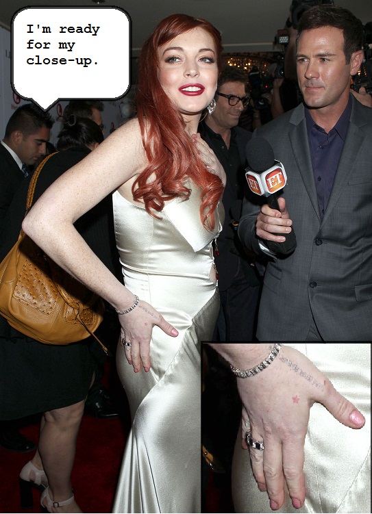 Donning a cheap-looking taffeta gown, Lindsay recalled old Hollywood glamour while highlighting her FUPA and flat ass. Her bad extensions and bright red lipstick almost drew attention away from the fact that Lindsay can’t afford a manicure, but not quite!